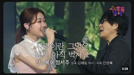 - [레전드 3] 50년 음악 인생의 진심 - 전영록&정서주 듀엣 무대영원한 오빠 전영록이 50년 음악 인생의 진심을 담아낸 무대는 물론, 신성 정서주와의 감탄이 쏟아진 듀엣 무대 역시 뜨거운 반응을 얻으며 '레전드 듀엣'으로 불렸습니다. 선후배의 아름다운 하모니가 깊은 여운을 남겼습니다. 전영록&정서주 듀엣 무대 바로가기 (유튜브)